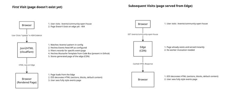 Key Insight : The JSON2HTML worker is a page generation engine, not a runtime proxy. It generates HTML once, stores it on the edge, and subsequent visits are served directly from the CDN — just like any other EDS page. Use "Update" from the Sidekick to regenerate pages when data or templates change.